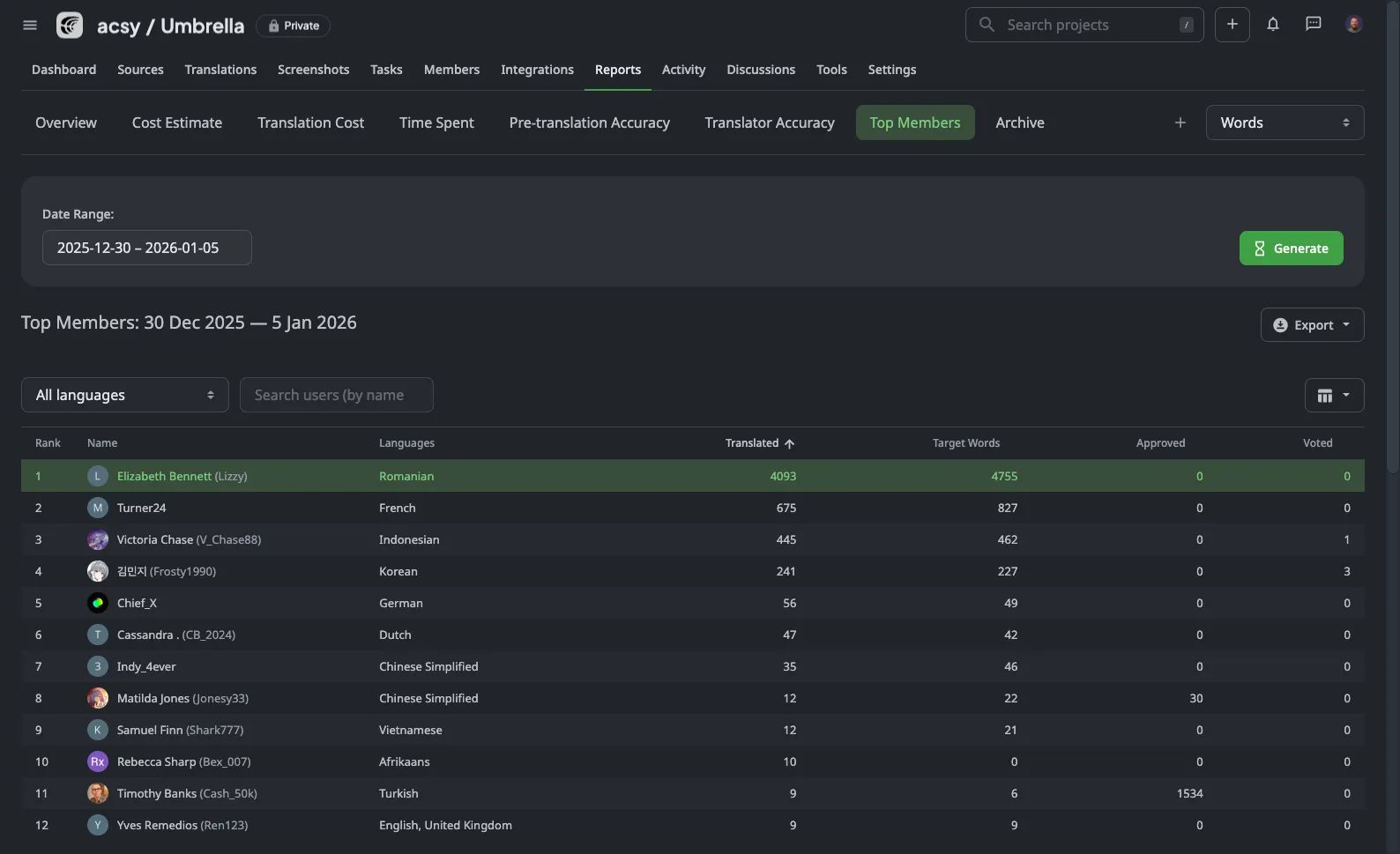 Identify most productive translators and proofreaders with approval ratios.